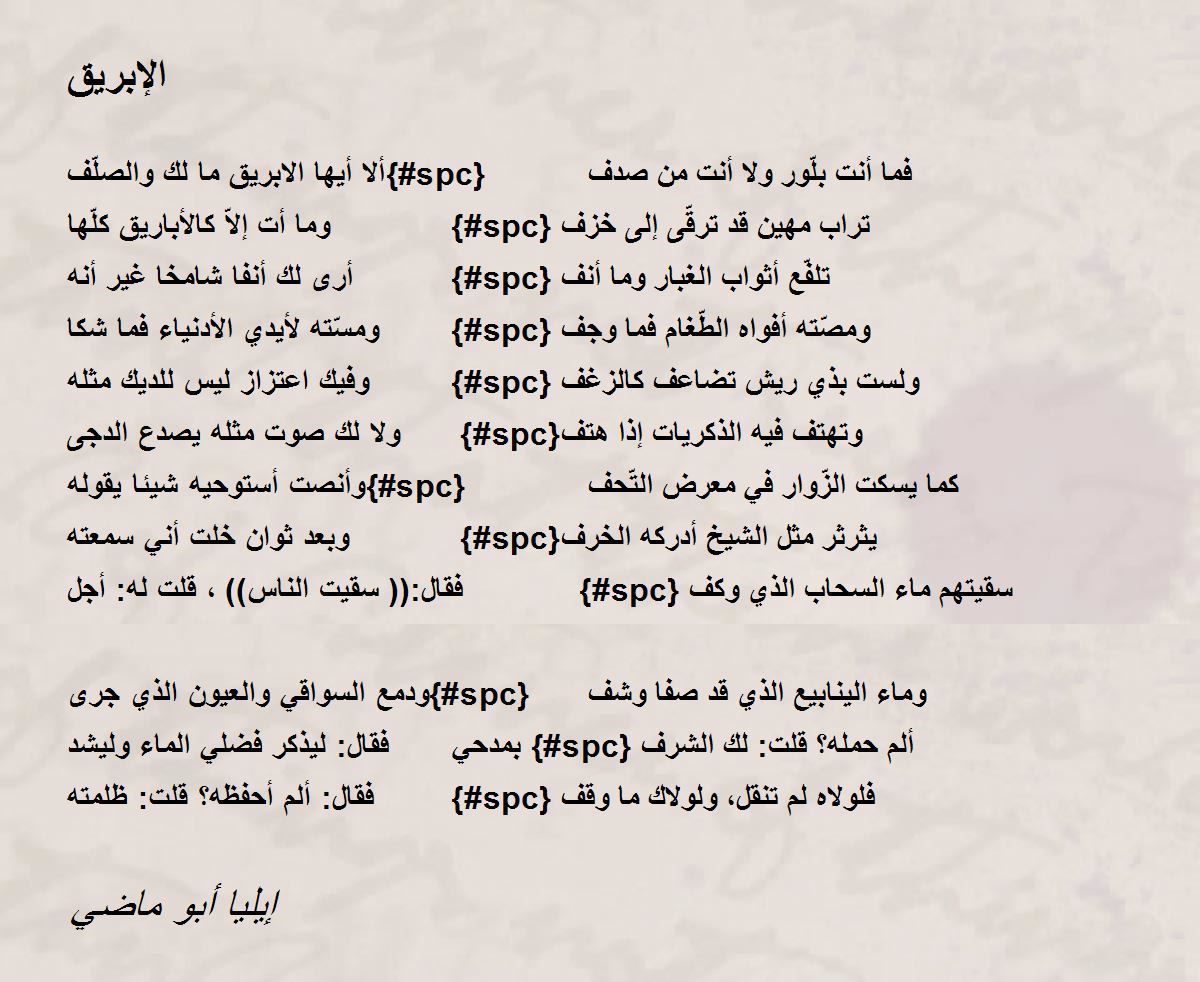 ألا أيها الابريق ما لك والصلّف{#spc} فما أنت بلّور ولا أنت من صدف