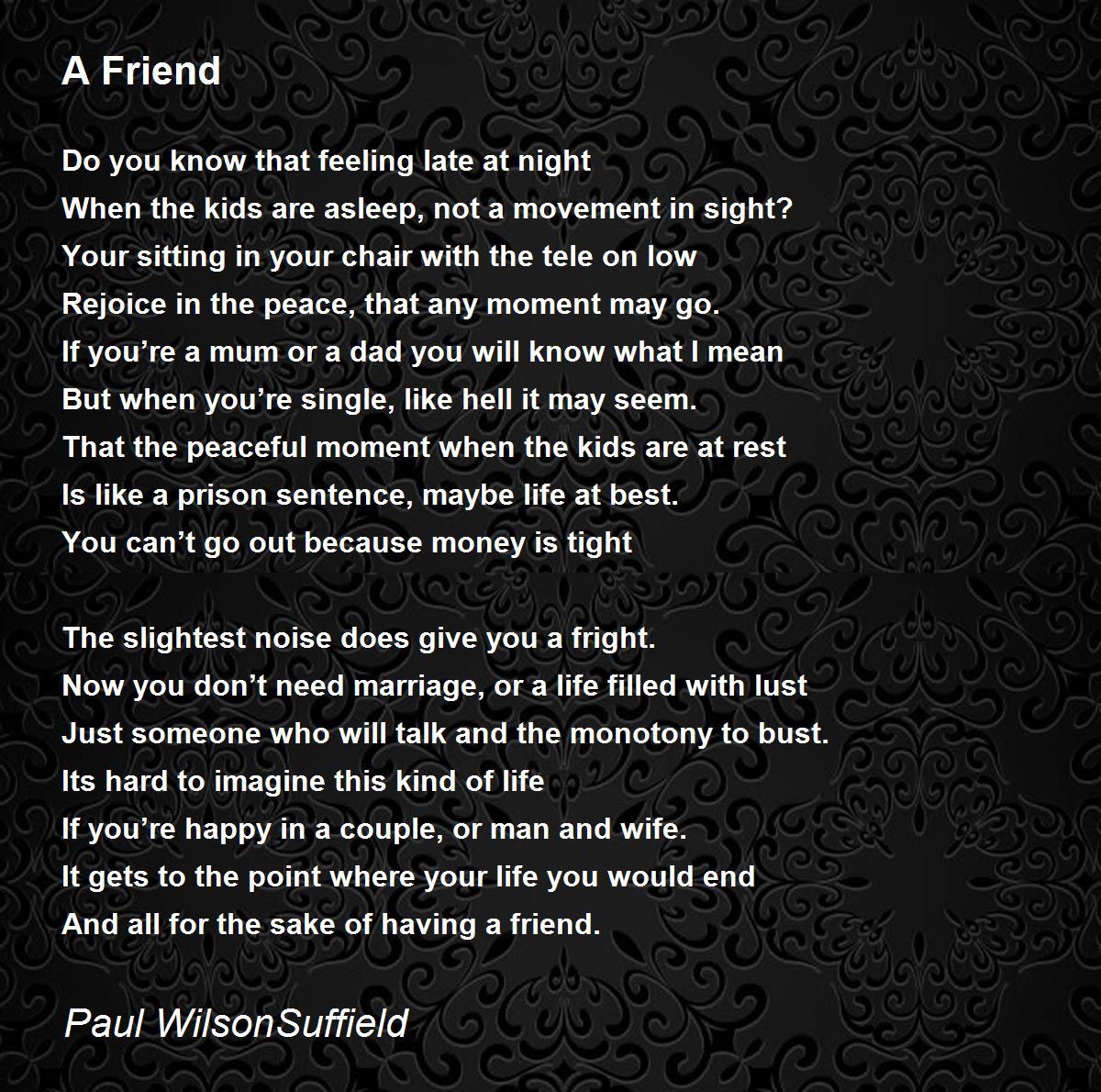 Hey man, I just wanted to comment and say I know exactly what your poem says and feels.... very well written my friend...