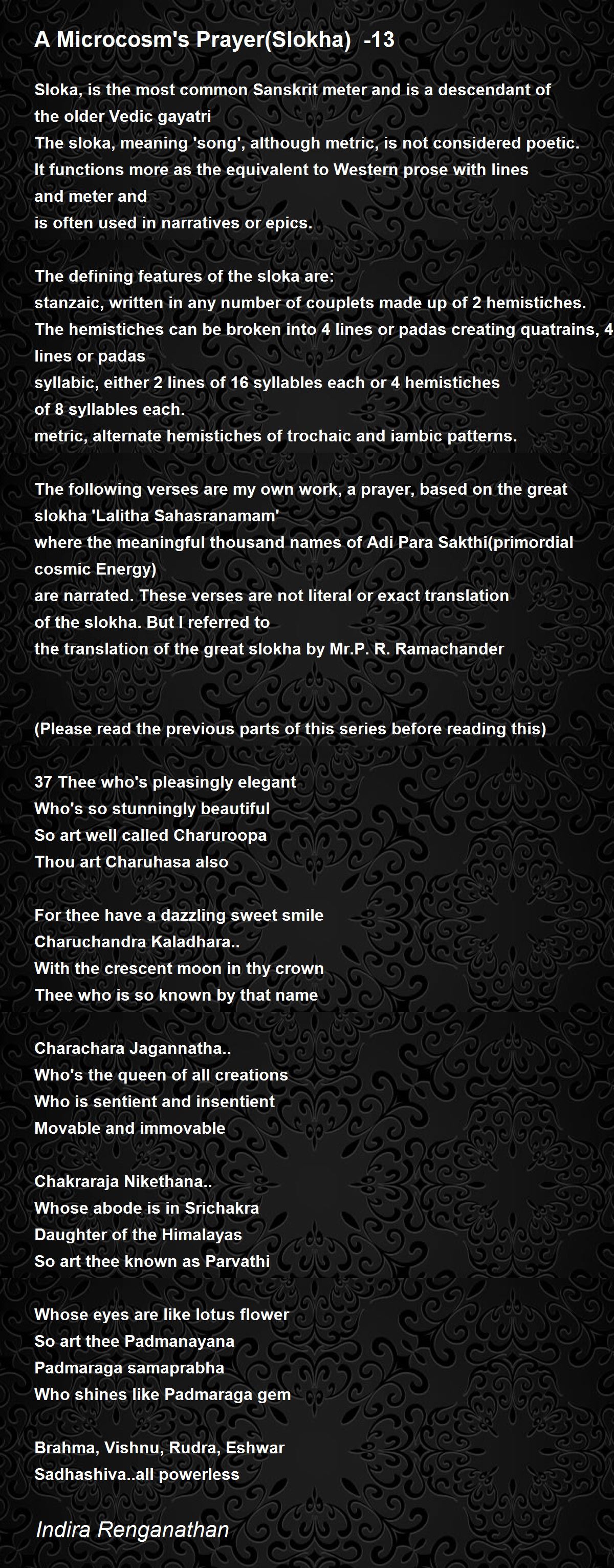 I read some verses from your own work based on the great slokha 'Lalitha Sahasranamam where the meaningful thousand name of Adipara Sakti are narrated. Some of them are Charu Rupa, Charu Hasa, Charachara Javannatha, Chakra Raja Niketana, Parvati etc. I hope readers may be pleased to know these. Thank u dear madam for sharing this here.