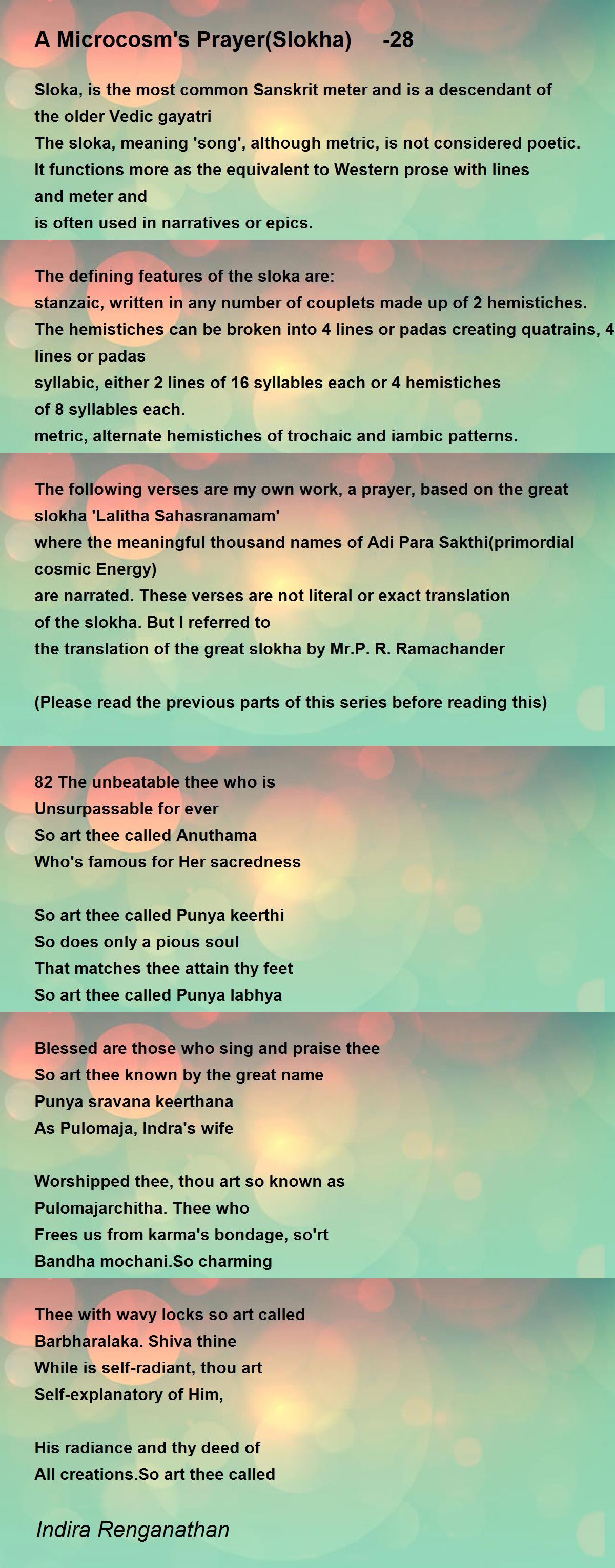 Sloka, is the most common Sanskrit meter and is a descendant of the older Vedic gayatri