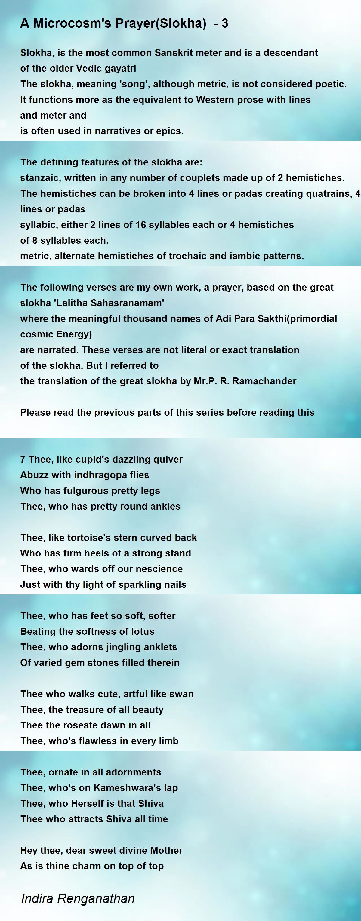 Slokha, is the most common Sanskrit meter and is a descendant of the older Vedic gayatri