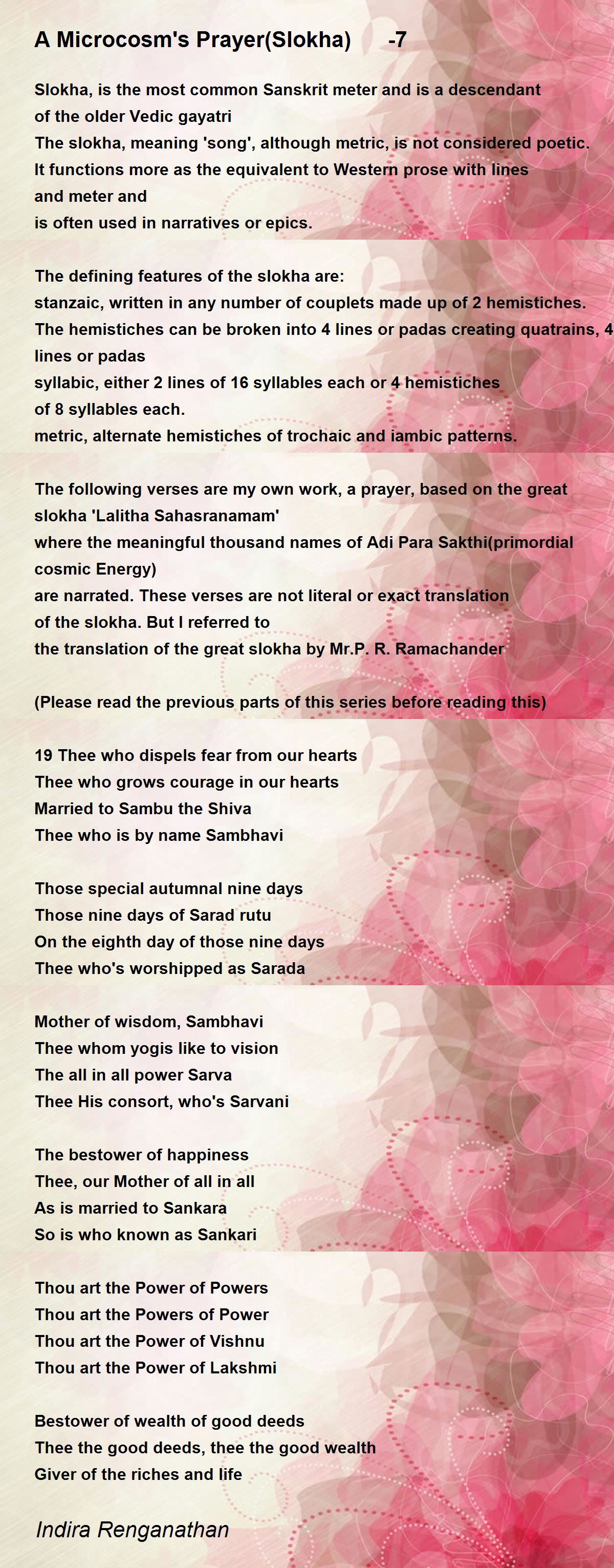 Slokha, is the most common Sanskrit meter and is a descendant of the older Vedic gayatri