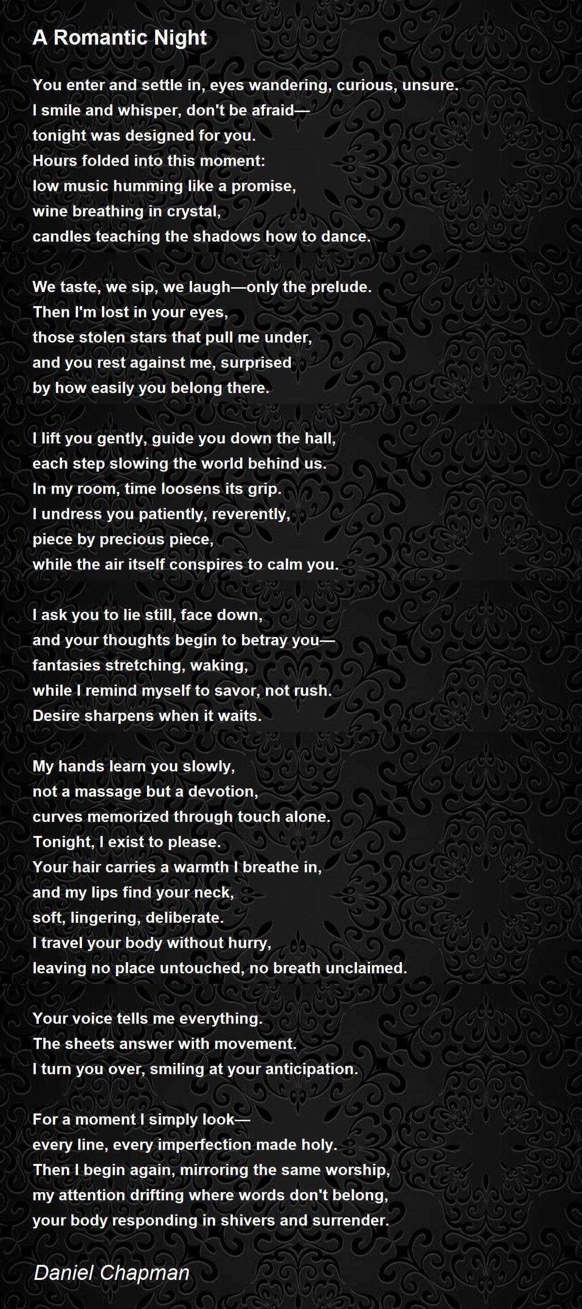 Now this is a poem! Whew! And a breathless undertaking, a fresh respect to such a wonderous thing as a romantic night. Well written and with the raw power and emotion so well expressed, it's a wonder my mouth hasn't gone dry with anticipation. Well done.