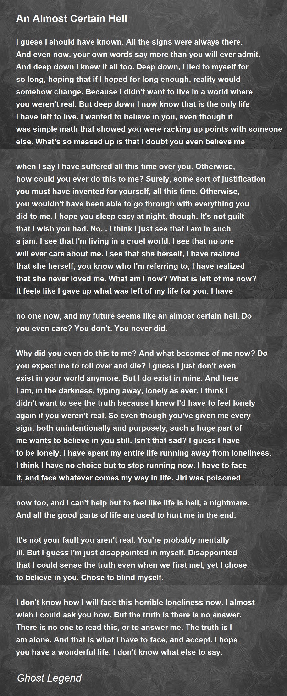 I guess I should have known. All the signs were always there. And even now, your own words say more than you will ever admit. And deep down I knew it all too. Deep down, I lied to myself for so long, hoping that if I hoped for long enough, reality would somehow change. Because I didn't want to live in a world where you weren't real. But deep down I now know that is the only life I have left to live. I wanted to believe in you, even though it was simple math that showed you were racking up points with someone else. What's so messed up is that I doubt you even believe me when I say I have suffered all this time over you. Otherwise, how could you ever do this to me? Surely, some sort of justification you must have invented for yourself, all this time. Otherwise, you wouldn't have been able to go through with everything you did to me. I hope you sleep easy at night, though. It's not guilt that I wish you had. No..I think I just see that I am in such a jam. I see that I'm living in a cruel world. I see that no one will ever care about me. I see that she herself, I have realized that she herself, you know who I'm referring to, I have realized that she never loved me. What am I now? What is left of me now? It feels like I gave up what was left of my life for you. I have no one now, and my future seems like an almost certain hell. Do you even care? You don't. You never did.