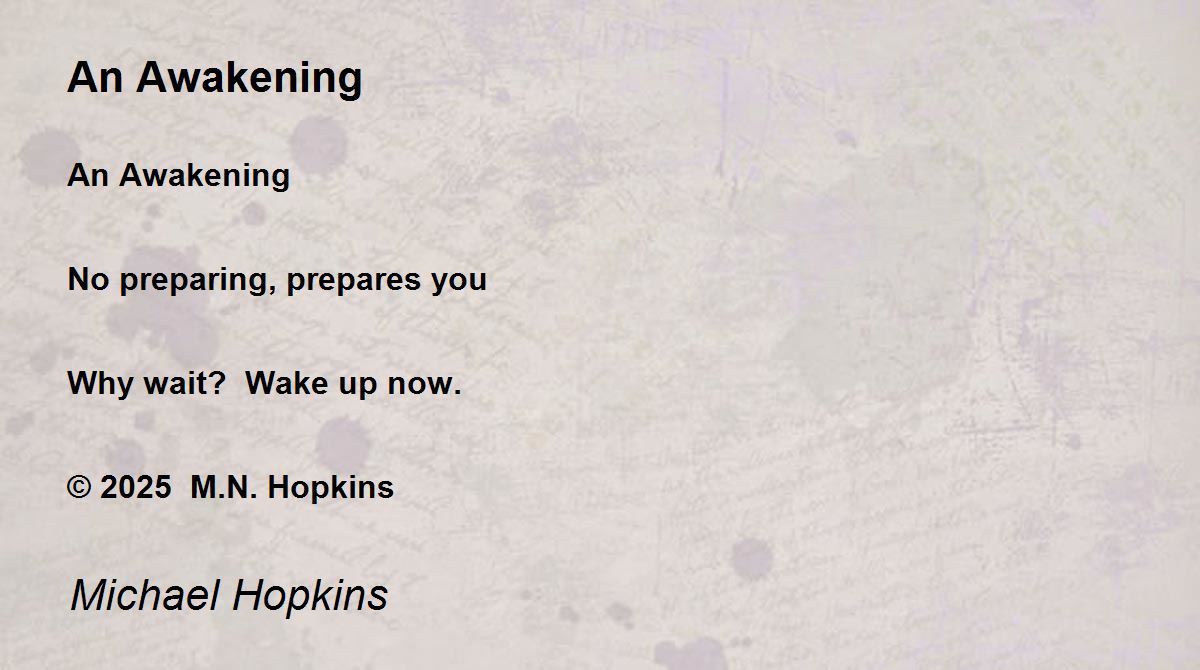 Note: I wrote this poem in the haiku style of poetry earlier this week and published it for the first time today, the 18th of October,2025. Most people are waiting for someone or something outside themselves to wake them up from their slumber when in reality it is a personal decision away. Ponder that if you will.