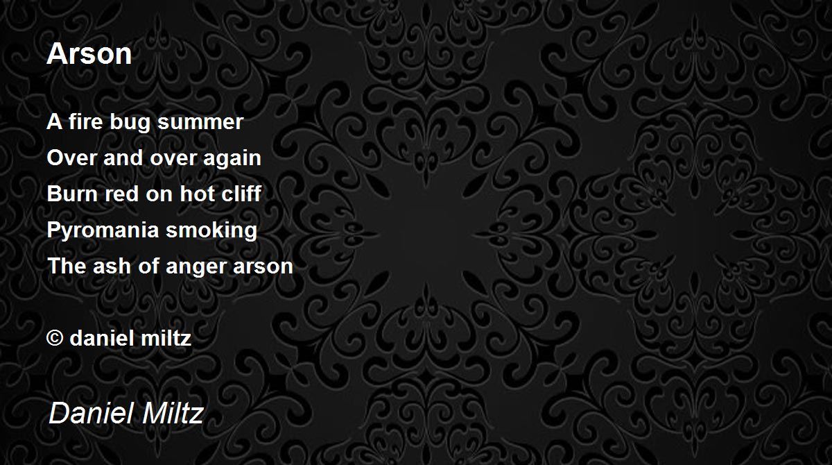 A fire bug summer Over and over again Burn red on hot cliff Pyromania smoking The ash of anger arson © daniel miltz