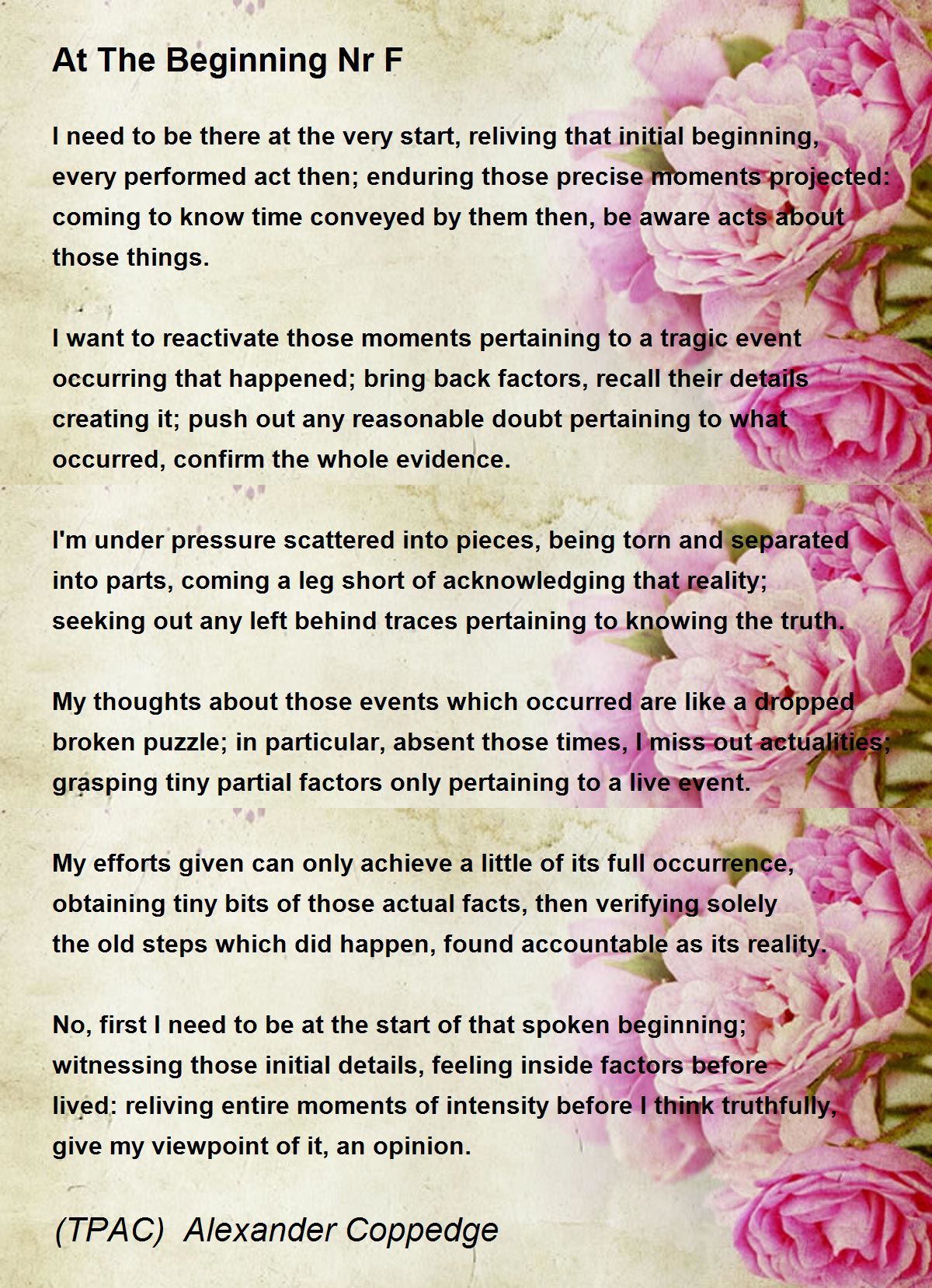 I need to be there at the very start, reliving that initial beginning, every performed act then; enduring those precise moments projected: coming to know time conveyed by them then, be aware acts about those things.