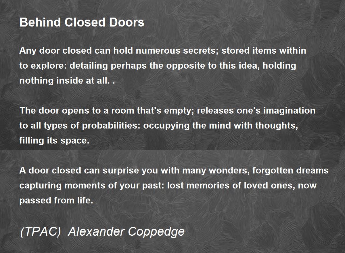 Any door closed can hold numerous secrets; stored items within to explore: detailing perhaps the opposite to this idea, holding nothing inside at all..