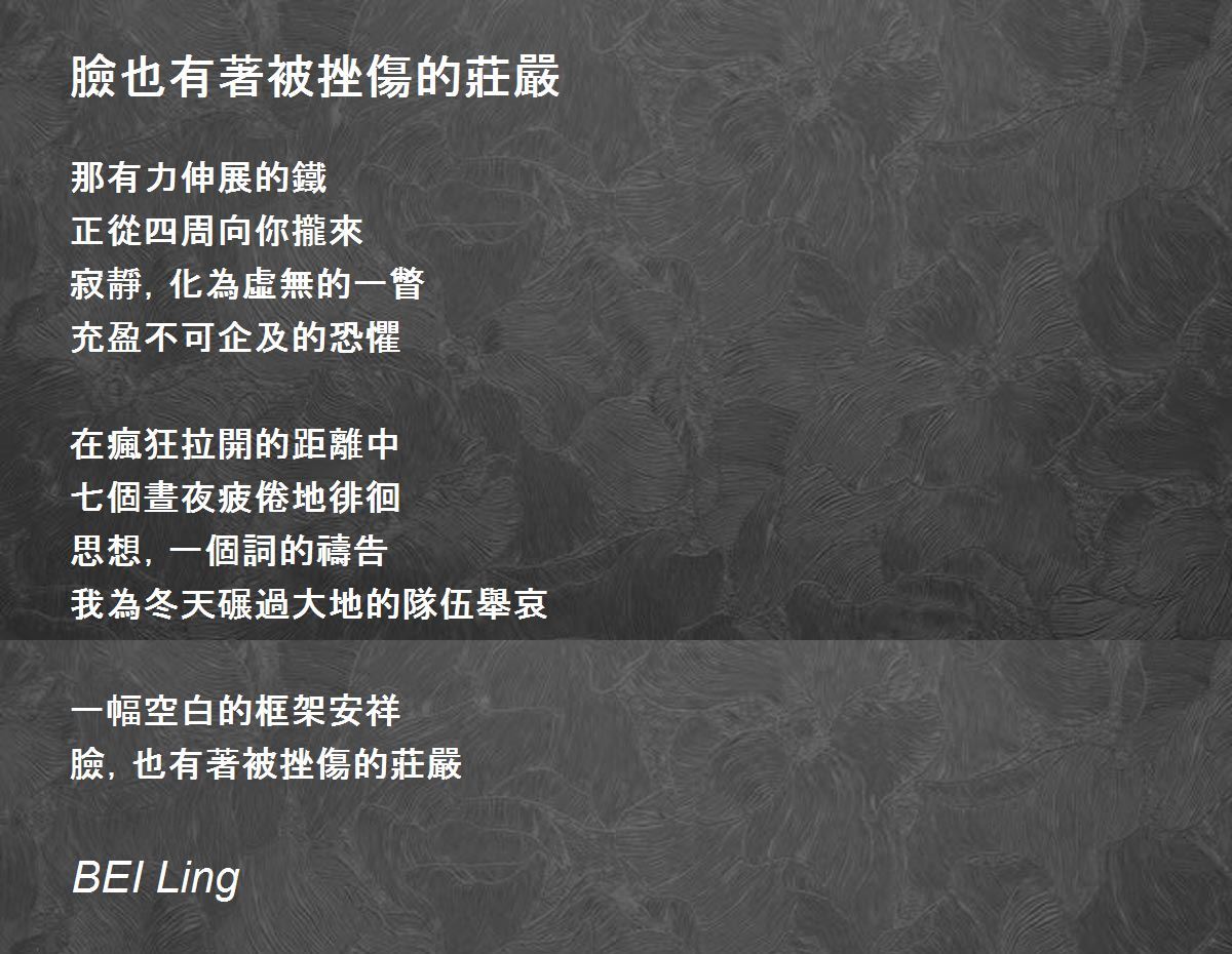 那有力伸展的鐵 正從四周向你攏來 寂靜,化為虛無的一瞥 充盈不可企及的恐懼 在瘋狂拉開的距離中 七個晝夜疲倦地徘徊 思想,一個詞的禱告 我為冬天碾過大地的隊伍舉哀 一幅空白的框架安祥 臉,也有著被挫傷的莊嚴