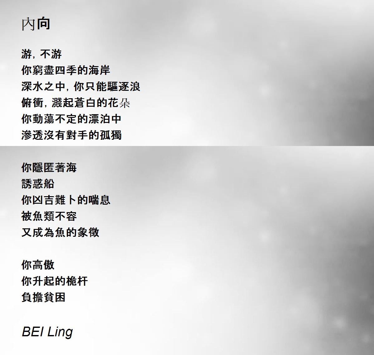 游,不游 你窮盡四季的海岸 深水之中,你只能驅逐浪 俯衝,濺起蒼白的花朵 你動蕩不定的漂泊中 滲透沒有對手的孤獨 你隱匿著海 誘惑船 你凶吉難卜的喘息 被魚類不容 又成為魚的象徵 你高傲 你升起的桅杆 負擔貧困