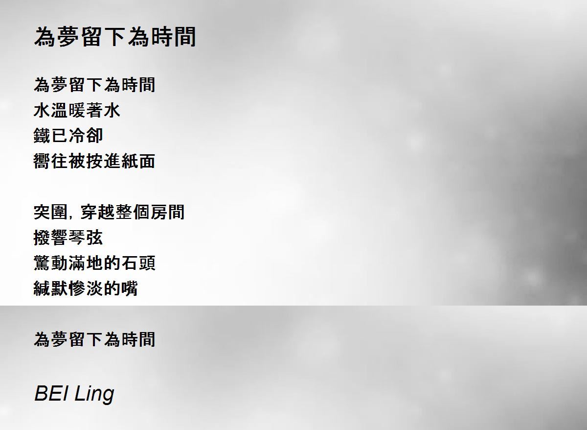 為夢留下為時間 水溫暖著水 鐵已冷卻 嚮往被按進紙面 突圍,穿越整個房間 撥響琴弦 驚動滿地的石頭 緘默慘淡的嘴 為夢留下為時間