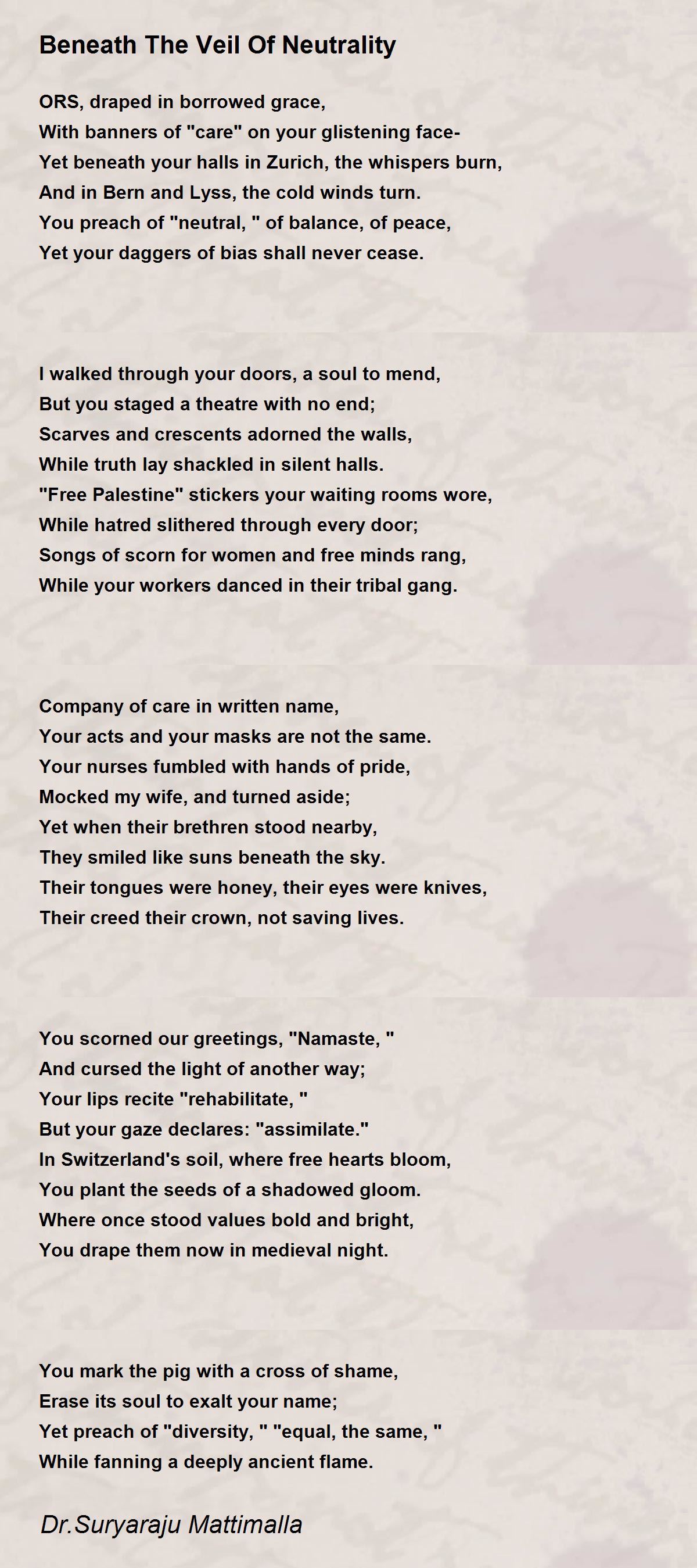 Dr. Suryaraju Mattimalla is a renowned poet, human rights scholar, vegan, asylum seeker, and free-speech advocate from Switzerland. He regularly publishes poems in American, Israeli, European, Indian, and Nagalim-based daily English newspapers and publication houses. He lives with his Ethiopian-Tigrayan wife, Selamawit Hailu Bezabih, and seven-year-old son, Saviour Suryaraju Mattimalla, in Switzerland. His family lived in Regensburg, Germany, where his second son, Stanford Suryaraju Mattimalla, was killed at 37 weeks and 3 days of pregnancy by a neo-Nazi German gynecologist by forceful 'Repevax' vaccination on June 28,2023. His first baby was killed by a Hindu honor killing in India in 2010.