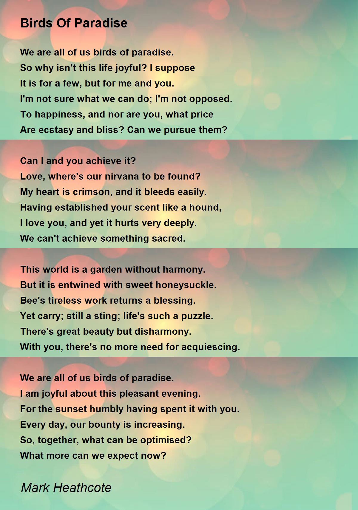 This world has lost harmony these days this provokes thought. But we need harmony and peace. We are souls and universal brothers. We are birds of beauty and freedom and we are messengers of peace in paradise.