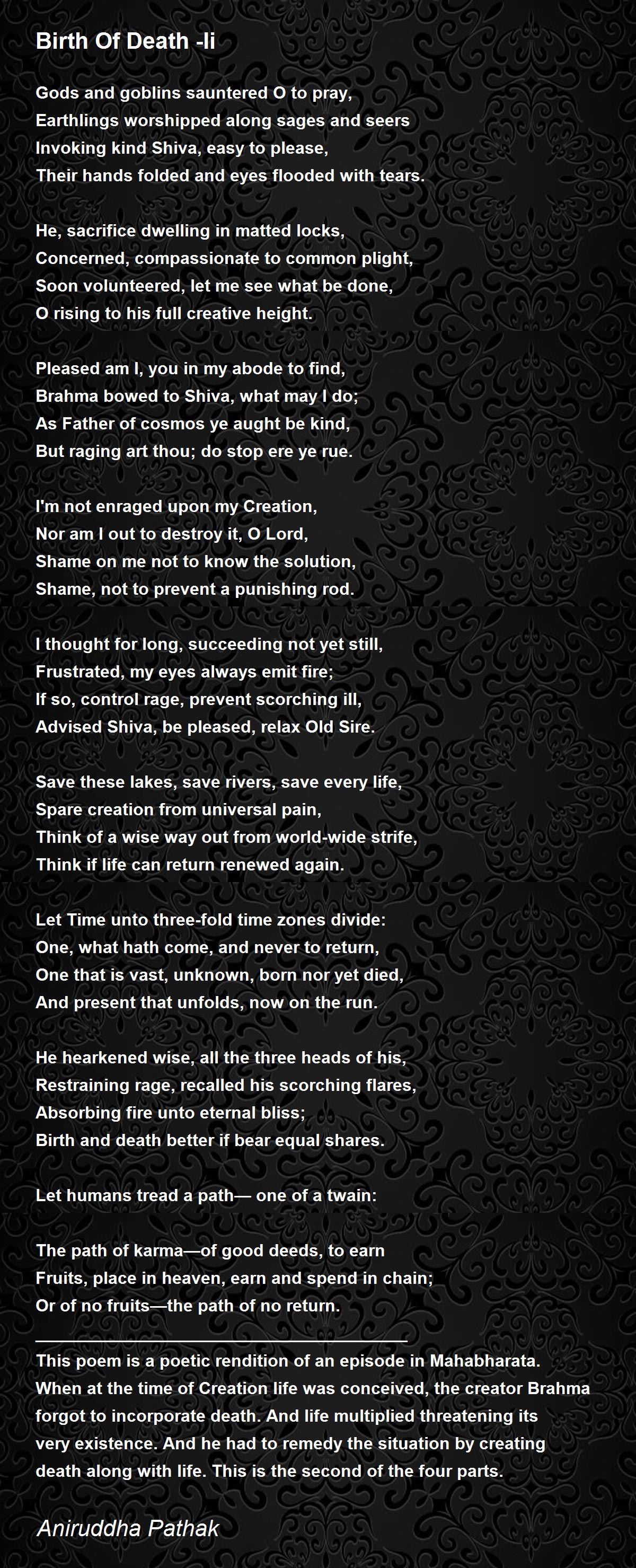 This poem is a poetic rendition of an episode in Mahabharata. When at the time of Creation life was conceived, the creator Brahma forgot to incorporate death. And life multiplied threatening its very existence. And he had to remedy the situation by creating death along with life. This is the second of the four parts.