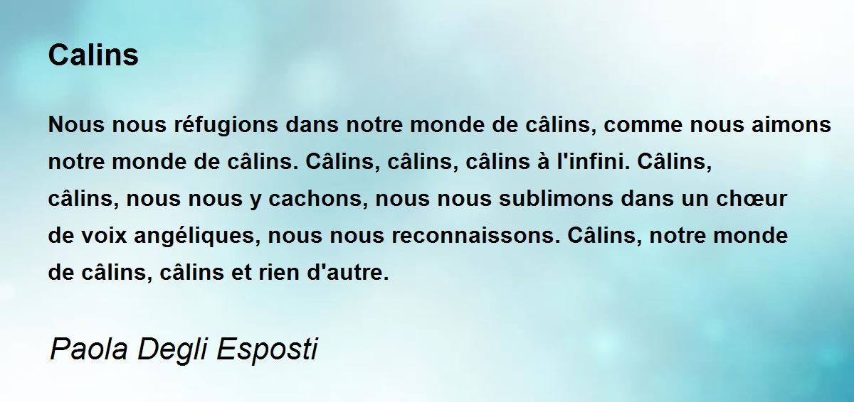 Nous nous réfugions dans notre monde de câlins, comme nous aimons notre monde de câlins. Câlins, câlins, câlins à l'infini. Câlins, câlins, nous nous y cachons, nous nous sublimons dans un chœur de voix angéliques, nous nous reconnaissons. Câlins, notre monde de câlins, câlins et rien d'autre.