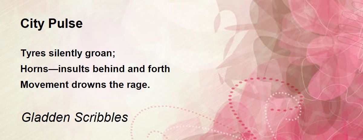 Tyres silently groan; Horns—insults behind and forth Movement drowns the rage.