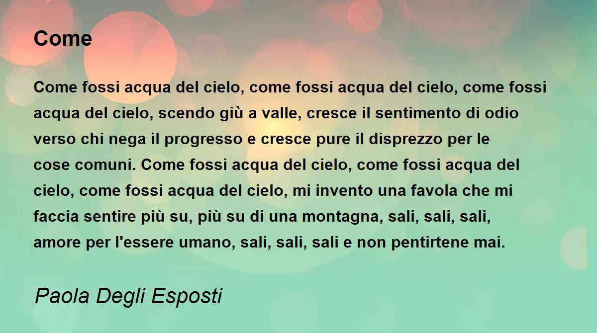 Come fossi acqua del cielo, come fossi acqua del cielo, come fossi acqua del cielo, scendo giù a valle, cresce il sentimento di odio verso chi nega il progresso e cresce pure il disprezzo per le cose comuni. Come fossi acqua del cielo, come fossi acqua del cielo, come fossi acqua del cielo, mi invento una favola che mi faccia sentire più su, più su di una montagna, sali, sali, sali, amore per l'essere umano, sali, sali, sali e non pentirtene mai.