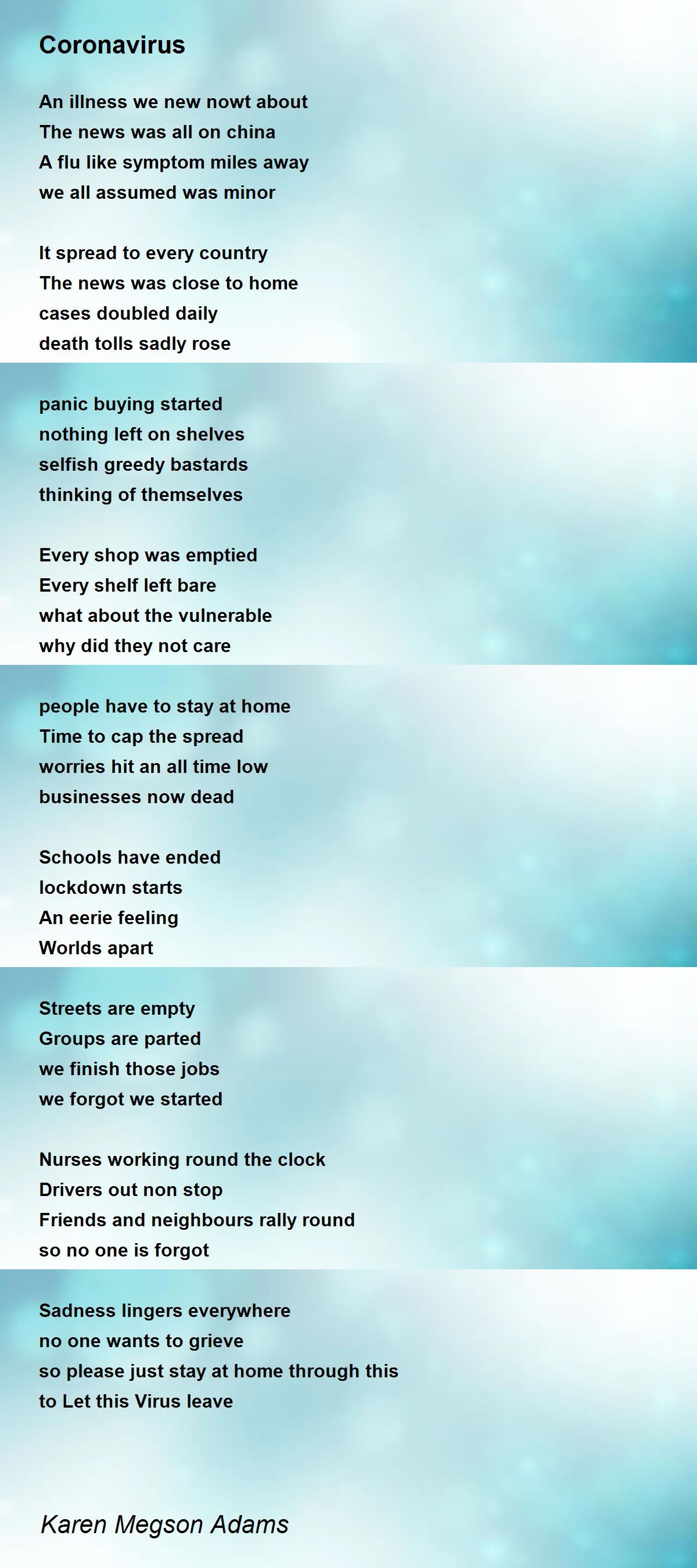 Great poem so well written that so perfectly sums up today's realism of how fragile we truly are. And if I may call you Karen. Well done Karen! You tell it how it is and pull no punches. 'Nurses working round the clock'... 10++ and added to thinking poem treasure chest. Thank you Karen for writing and sharing your fine poem. Take care and the loved ones around you. I wish you well.