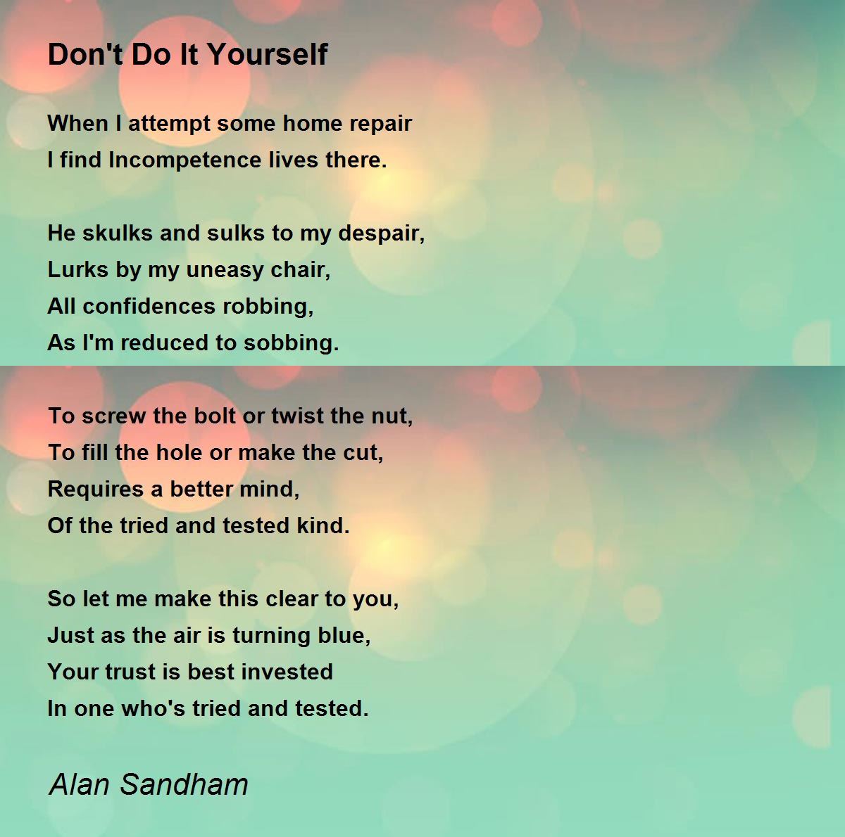 Insurance Loves Real Plumbers Real Electricians there is wisdom in knowing what you can do leaving to professionals whatever you can't insurance loves real plumbers real electricians Inspired by the poem 'Don't Do It Yourself' by the poet Alan Sandham. Dedicated to the poet Alan Sandham.