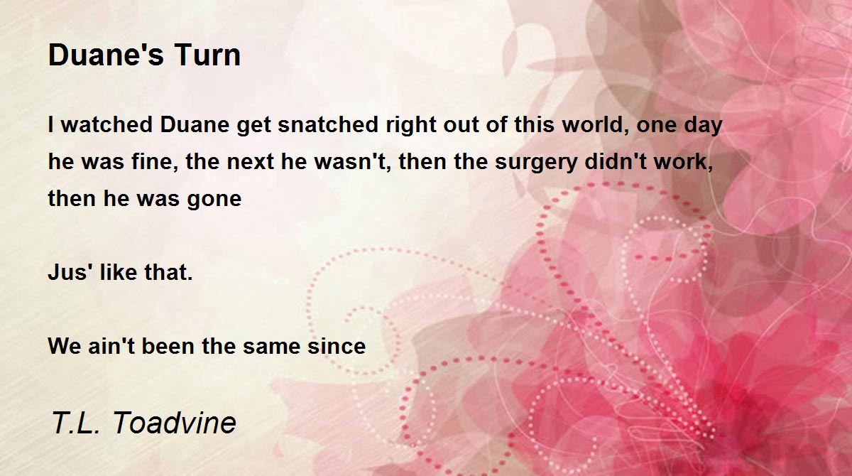 I watched Duane get snatched right out of this world, one day he was fine, the next he wasn't, then the surgery didn't work, then he was gone