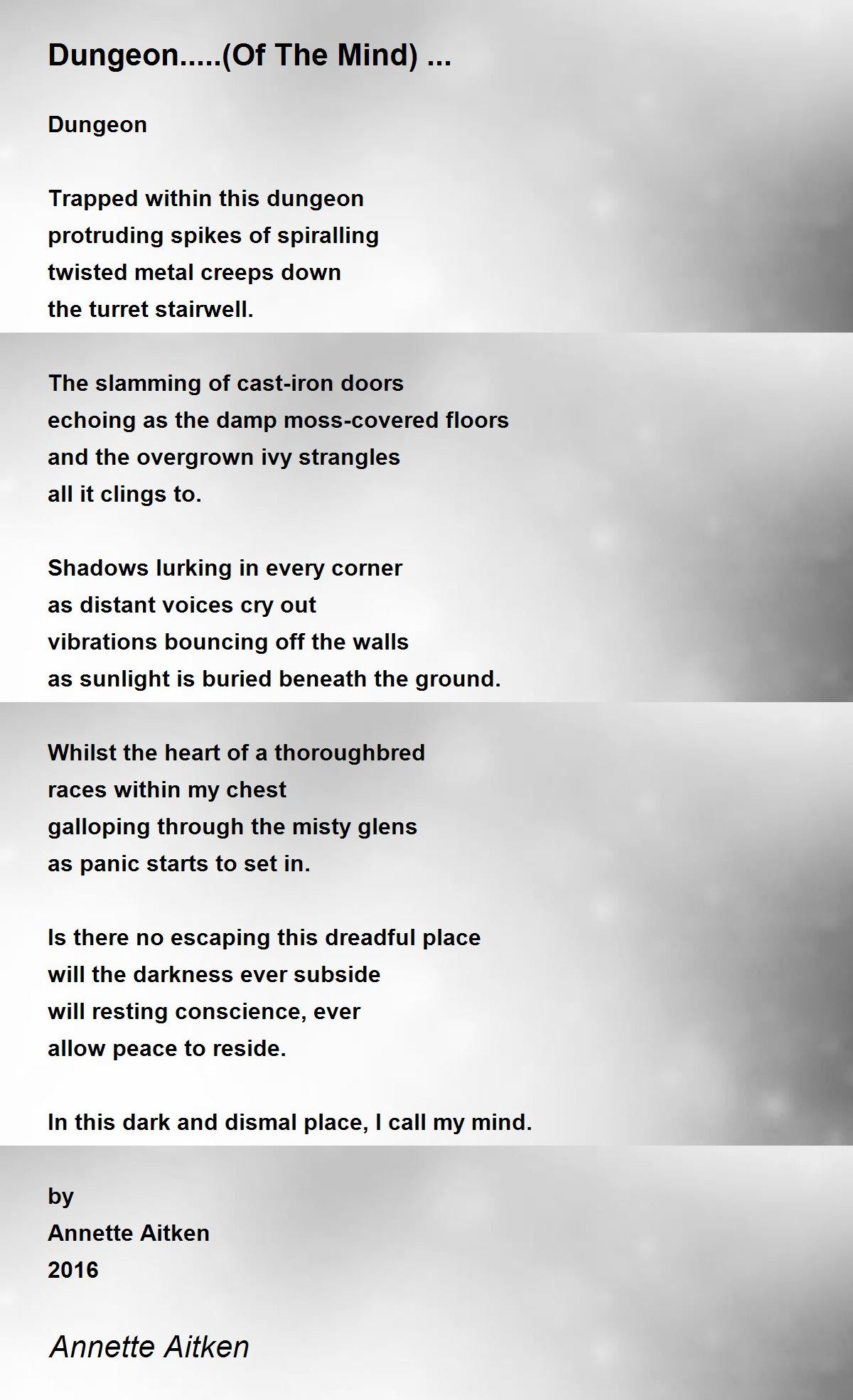 spikes......creep no s needed; easy mistake to make and overlook. but i REALLY like [love, actually] the stanza otherwise. loving the poem so far. will resting conscience, ever...... i say that the comma is not needed, BUT it does seem to serve a 'good' purpose here. i enjoyed the snatches of rhyming. the extended title was a clue to the ending, but Bri likes to think in terms of REAL dungeons..... [i had one put in our house here; only 3 prisoners at this time; i caught one putting a parking ticket on our car one night]....so, , , , the ending, cleverly separated from preceding lines, caught me by SURPRISE! a great poem. However, i'm sorry your mind is like that. : ( : ( i thought the only thing i did not understand was your Poet's Note. do i have to be British? to MyPoemList for sure and to May's showcase IF you don't object. call me! hee-hee. bri :) this might have been scary for me, EXCEPT for the fact i am so used to our dungeon by now. every week i have to drag out the corpses, UNLESS the living prisoners (or rats) have gotten to them before i make my visit. a few bones i can carry out quite easily! bri :)