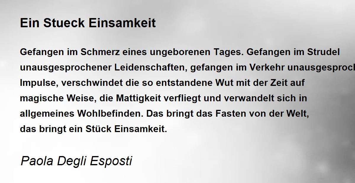 Gefangen im Schmerz eines ungeborenen Tages. Gefangen im Strudel unausgesprochener Leidenschaften, gefangen im Verkehr unausgesprochener Impulse, verschwindet die so entstandene Wut mit der Zeit auf magische Weise, die Mattigkeit verfliegt und verwandelt sich in allgemeines Wohlbefinden. Das bringt das Fasten von der Welt, das bringt ein Stück Einsamkeit.