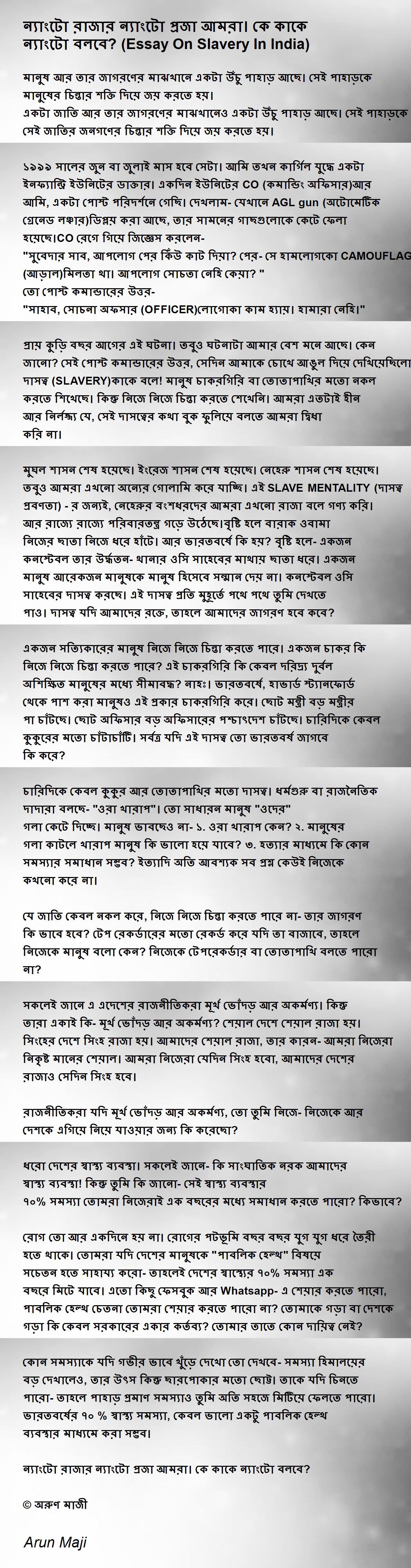 প্রায় কুড়ি বছর আগের এই ঘটনা। তবুও ঘটনাটা আমার বেশ মনে আছে। কেন জানো? সেই পোস্ট কমান্ডারের উত্তর, সেদিন আমাকে চোখে আঙুল দিয়ে দেখিয়েছিলো দাসত্ব (SLAVERY)কাকে বলে! মানুষ চাকরগিরি বা তোতাপাখির মতো নকল করতে শিখেছে। কিন্তু নিজে নিজে চিন্তা করতে শেখেনি। আমরা এতটাই হীন আর নির্লজ্জ্য যে, সেই দাসত্বের কথা বুক ফুলিয়ে বলতে আমরা দ্বিধা করি না।