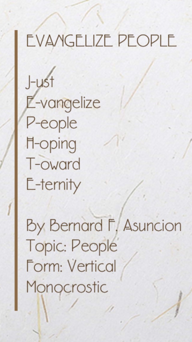 J-ust E-vangelize P-eople H-oping T-oward E-ternity Form: Vertical Monocrostic