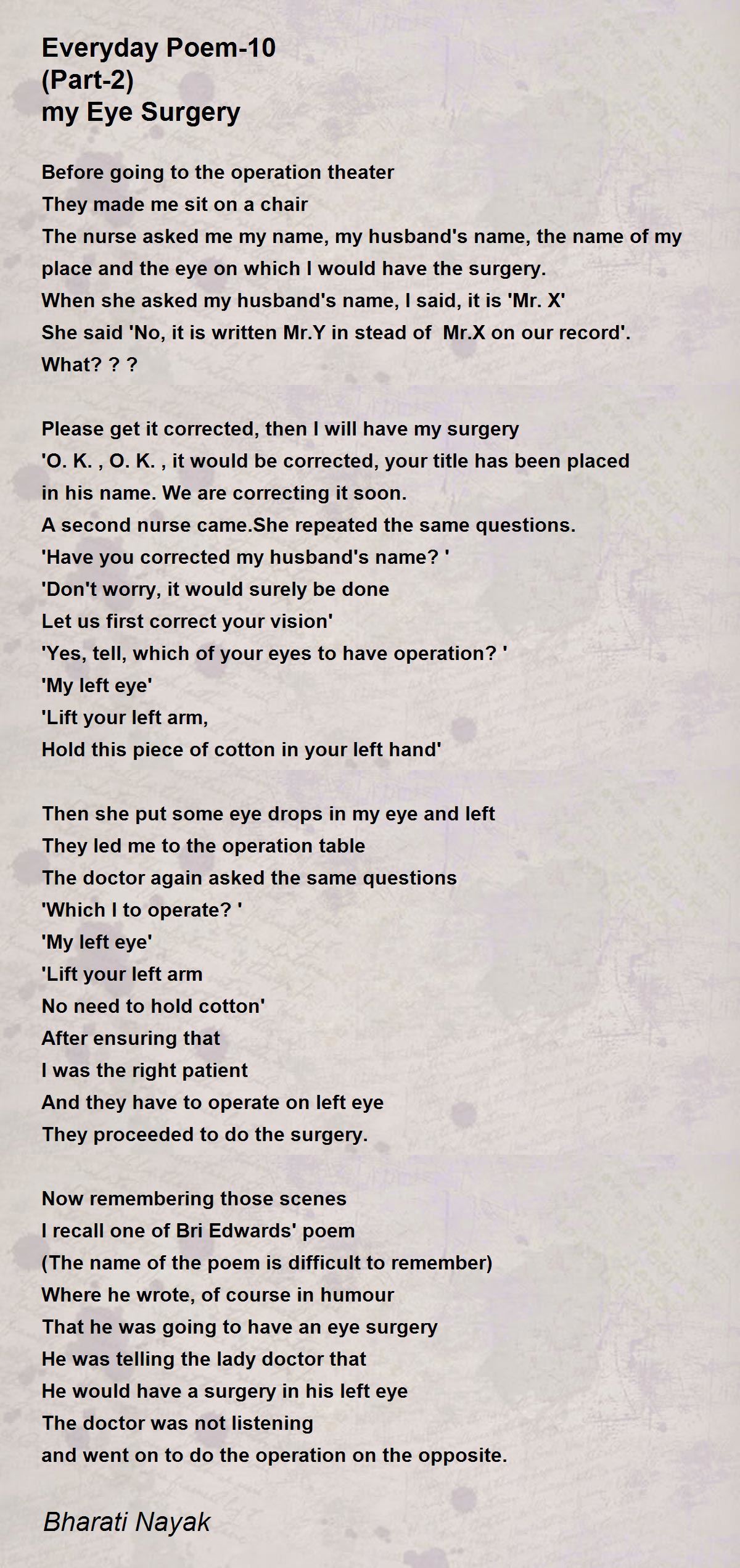 The nurse asked me my name, my husband's name, the name of my place and the eye on which I would have the surgery.