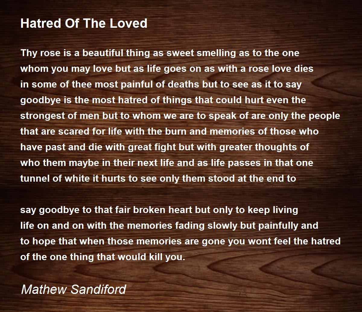 Thy rose is a beautiful thing as sweet smelling as to the one whom you may love but as life goes on as with a rose love dies in some of thee most painful of deaths but to see as it to say goodbye is the most hatred of things that could hurt even the strongest of men but to whom we are to speak of are only the people that are scared for life with the burn and memories of those who have past and die with great fight but with greater thoughts of who them maybe in their next life and as life passes in that one tunnel of white it hurts to see only them stood at the end to say goodbye to that fair broken heart but only to keep living life on and on with the memories fading slowly but painfully and to hope that when those memories are gone you wont feel the hatred of the one thing that would kill you.