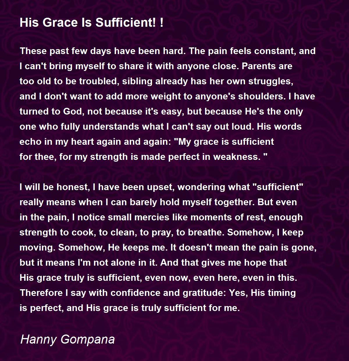 I will be honest, I have been upset, wondering what "sufficient" really means when I can barely hold myself together. But even in the pain, I notice small mercies like moments of rest, enough strength to cook, to clean, to pray, to breathe. Somehow, I keep moving. Somehow, He keeps me. It doesn't mean the pain is gone, but it means I'm not alone in it. And that gives me hope that His grace truly is sufficient, even now, even here, even in this. Therefore I say with confidence and gratitude: Yes, His timing is perfect, and His grace is truly sufficient for me.