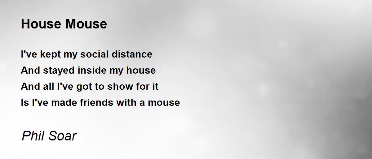 I've kept my social distance And stayed inside my house And all I've got to show for it Is I've made friends with a mouse