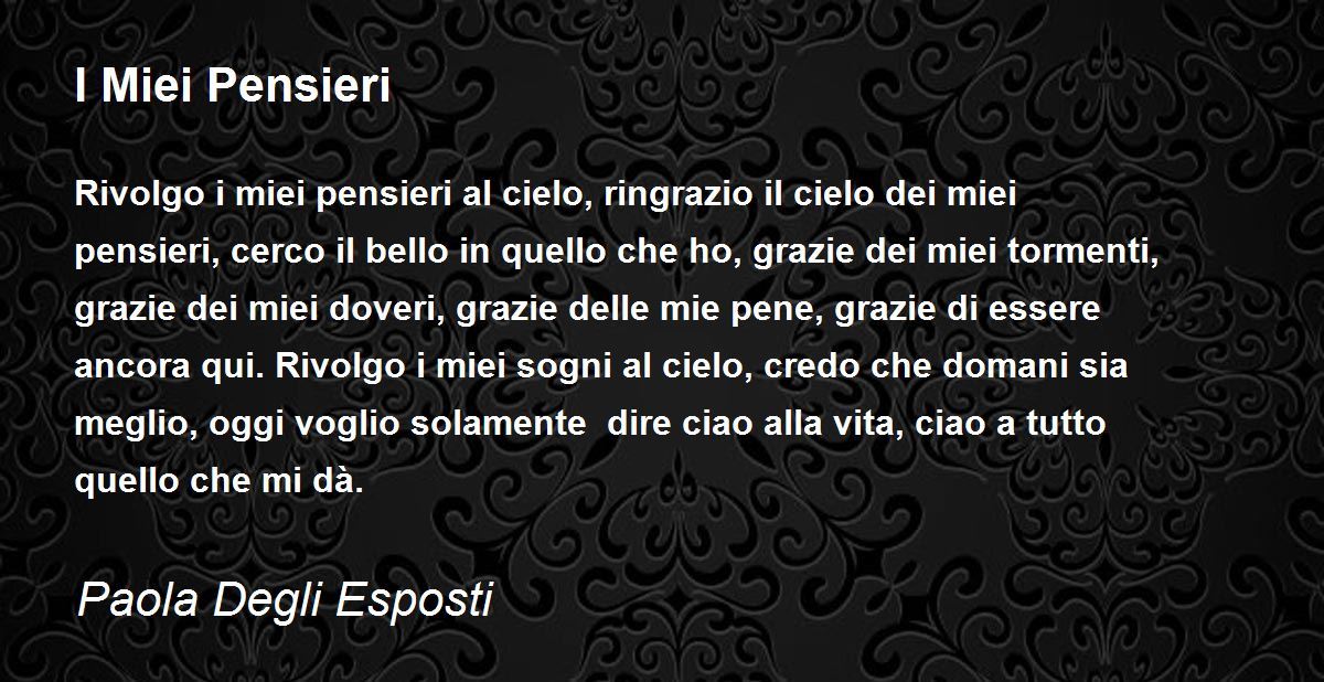 Rivolgo i miei pensieri al cielo, ringrazio il cielo dei miei pensieri, cerco il bello in quello che ho, grazie dei miei tormenti, grazie dei miei doveri, grazie delle mie pene, grazie di essere ancora qui. Rivolgo i miei sogni al cielo, credo che domani sia meglio, oggi voglio solamente dire ciao alla vita, ciao a tutto quello che mi dà.