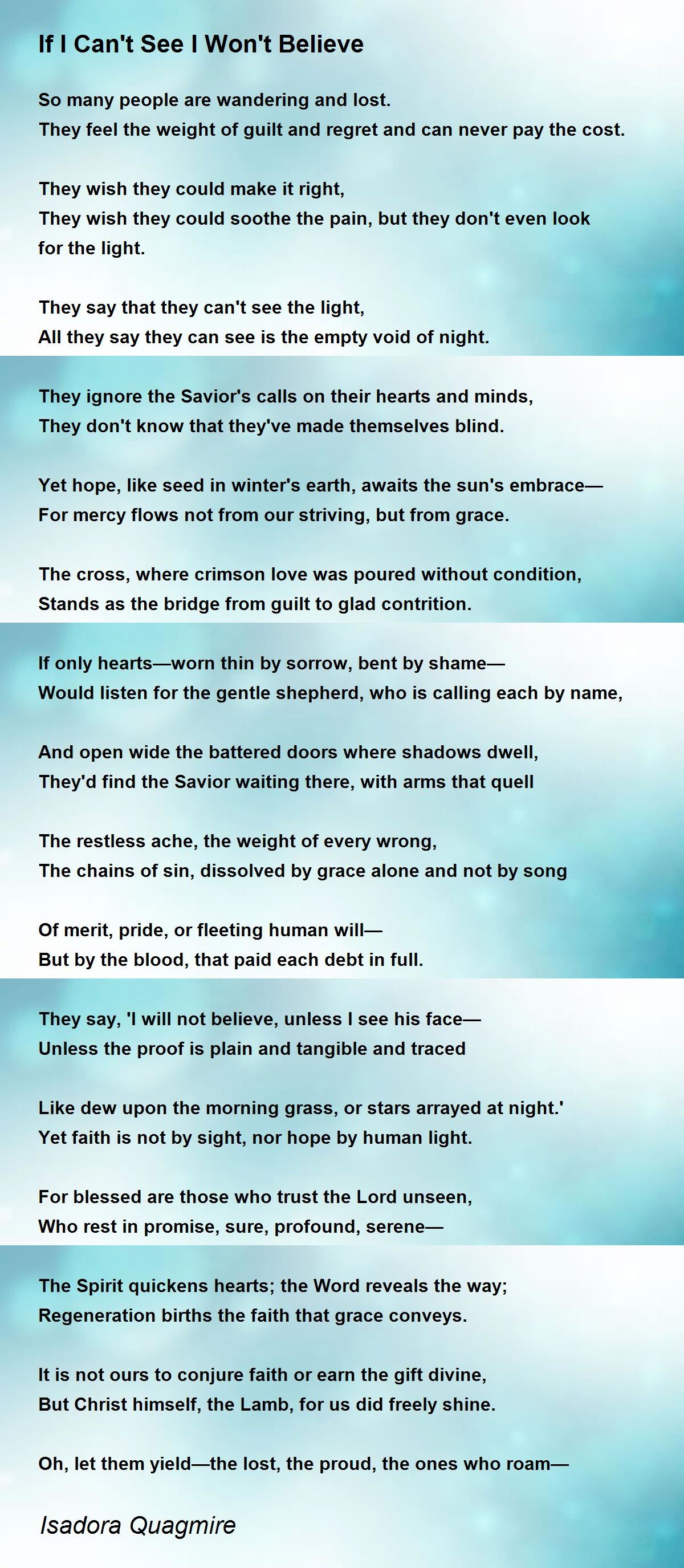 A wonderful and powerful poem of faith in God.. It expresses trusting in promises that are not yet visible. Very convincing words that fuel one's mind and heart to be with God. Very, very inspiring.