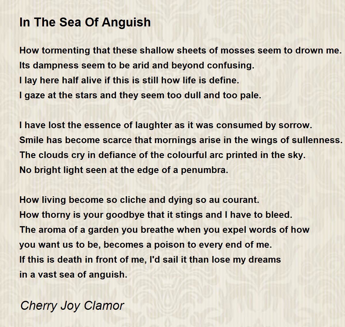 I have lost the essence of laughter as it was consumed by sorrow. Smile has become scarce that mornings arise in the wings of sullenness. The clouds cry in defiance of the colourful arc printed in the sky. No bright light seen at the edge of a penumbra. i will sail it than lose my dreams........ finally very pathetic. come out of the depressive mood and learn to live. life is a celebration. but we have to make it a celebration. tony