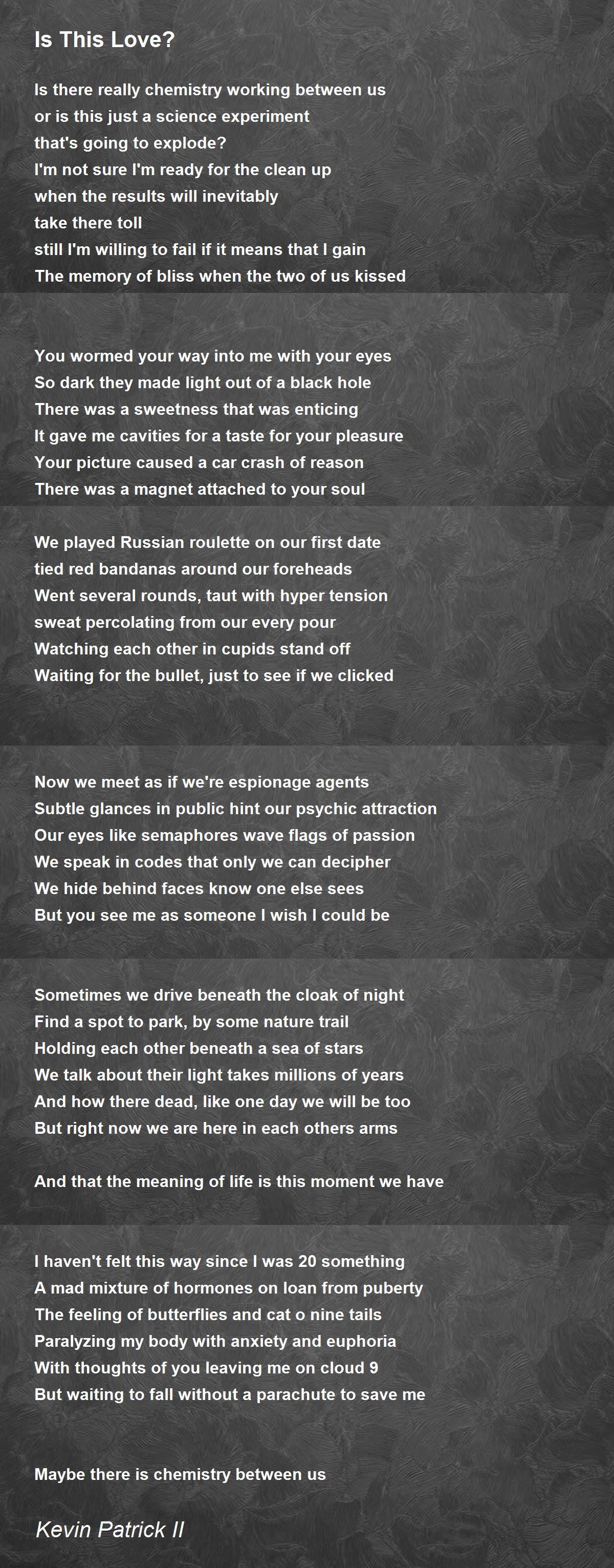 Is there really chemistry working between us or is this just a science experiment that's going to explode? I'm not sure I'm ready for the clean up when the results will inevitably take there toll still I'm willing to fail if it means that I gain The memory of bliss when the two of us kissed