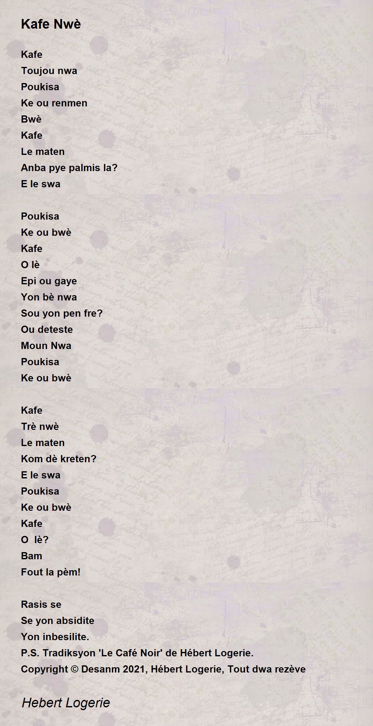 P.S. Tradiksyon 'Le Café Noir' de Hébert Logerie.