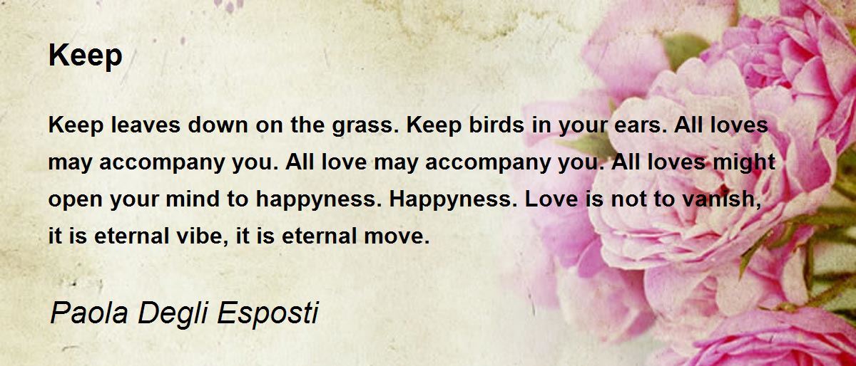 Keep leaves down on the grass. Keep birds in your ears. All loves may accompany you. All love may accompany you. All loves might open your mind to happyness.Happyness. Love is not to vanish, it is eternal vibe, it is eternal move.