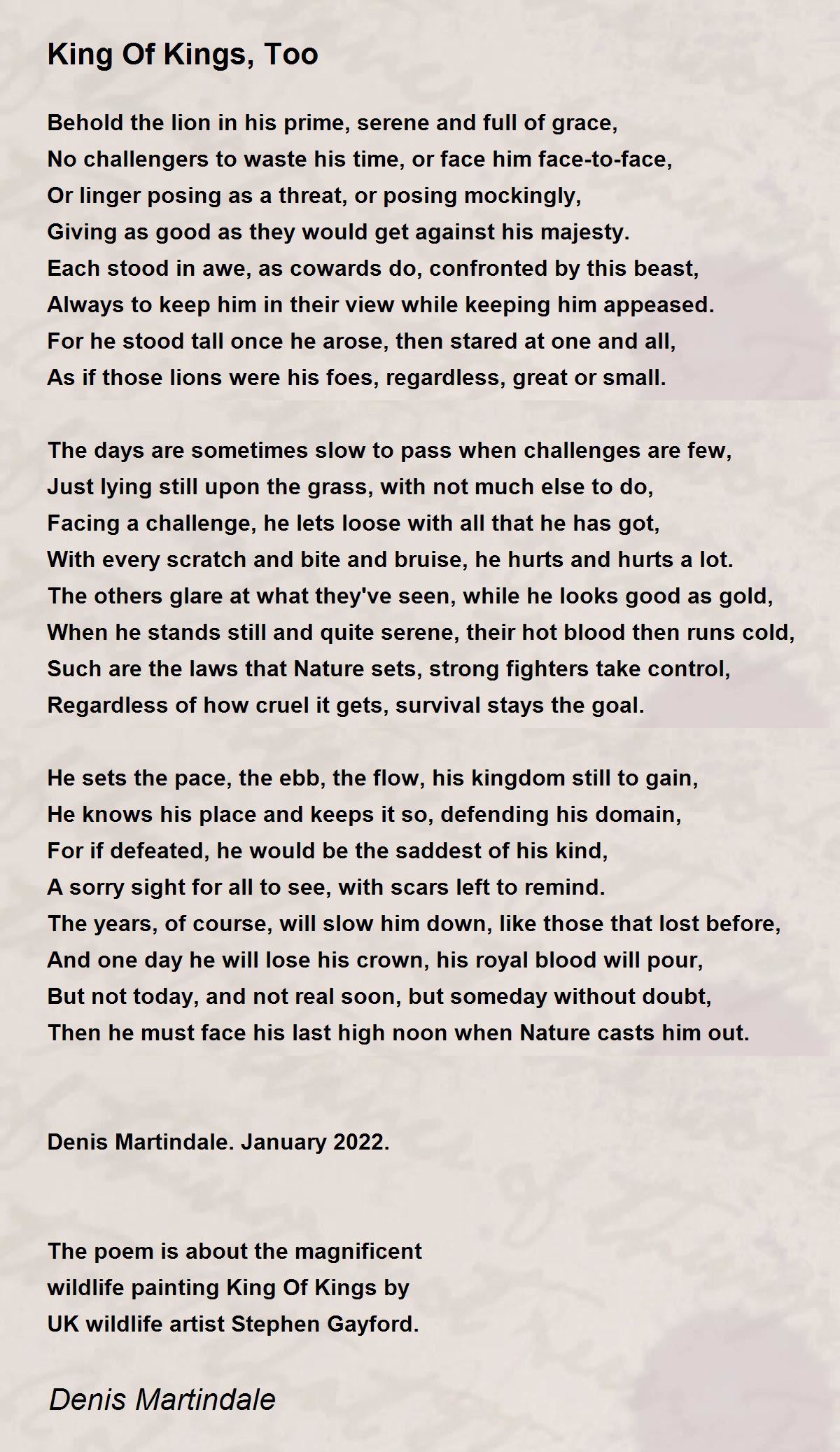 Behold the lion in his prime, serene and full of grace,