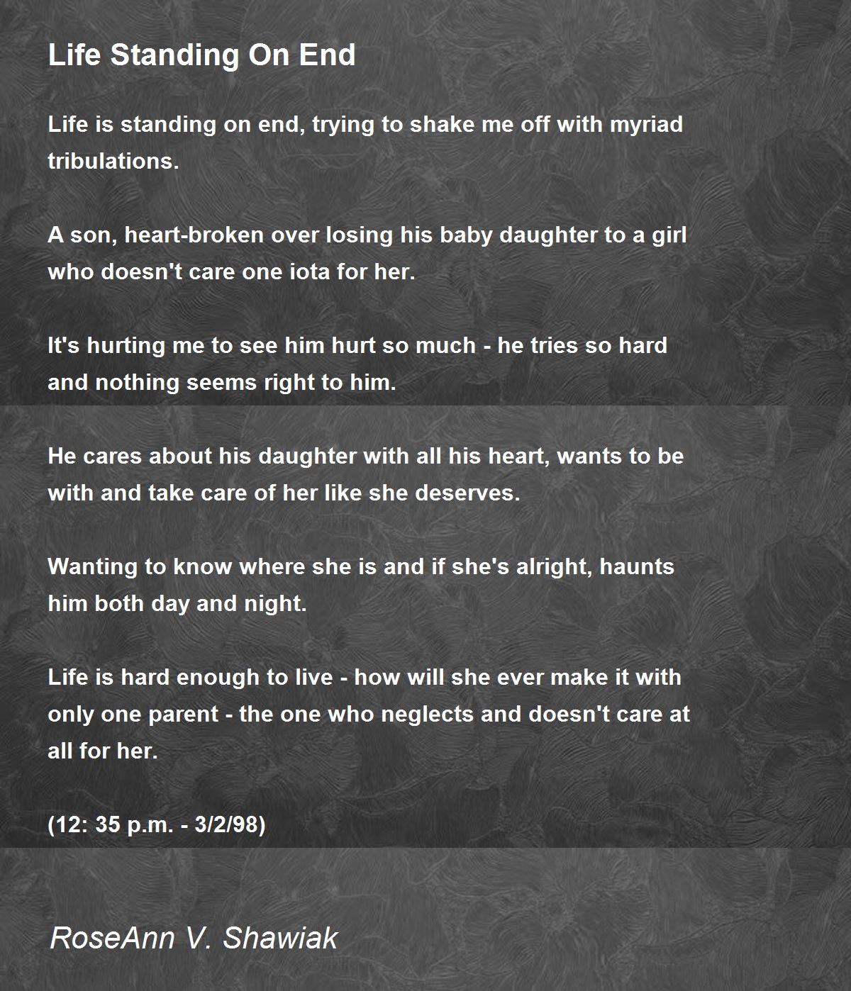 Life is standing on end, trying to shake me off with myriad