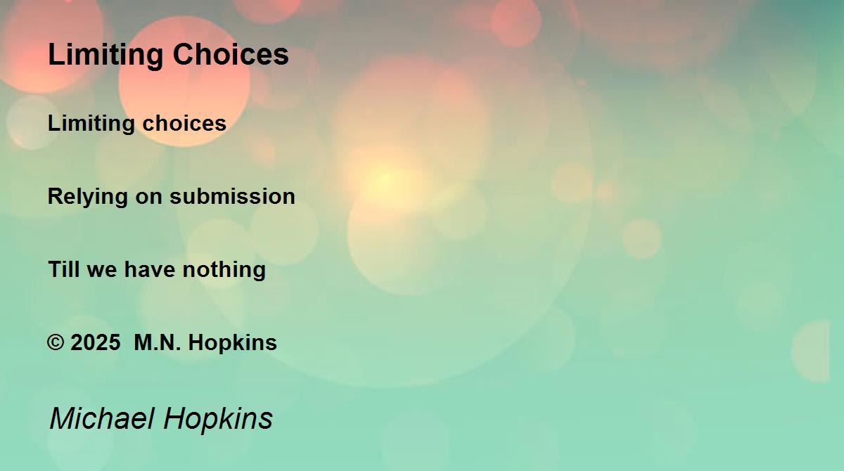Note: I wrote this poem yesterday in the haiku style of poetry yesterday and published it for the first time today, the 30th of October,2025. If you have yet not noticed we have been given fewer and fewer choices in our corporate corrupted and controlled world. A good detox of the parasites will change this paradigm.