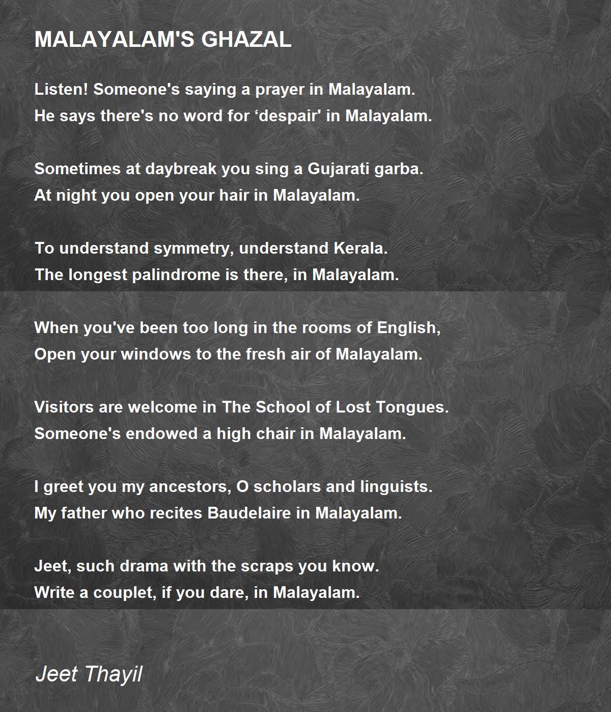 MALAYALAM'S GHAZAL Poem by Jeet Thayil