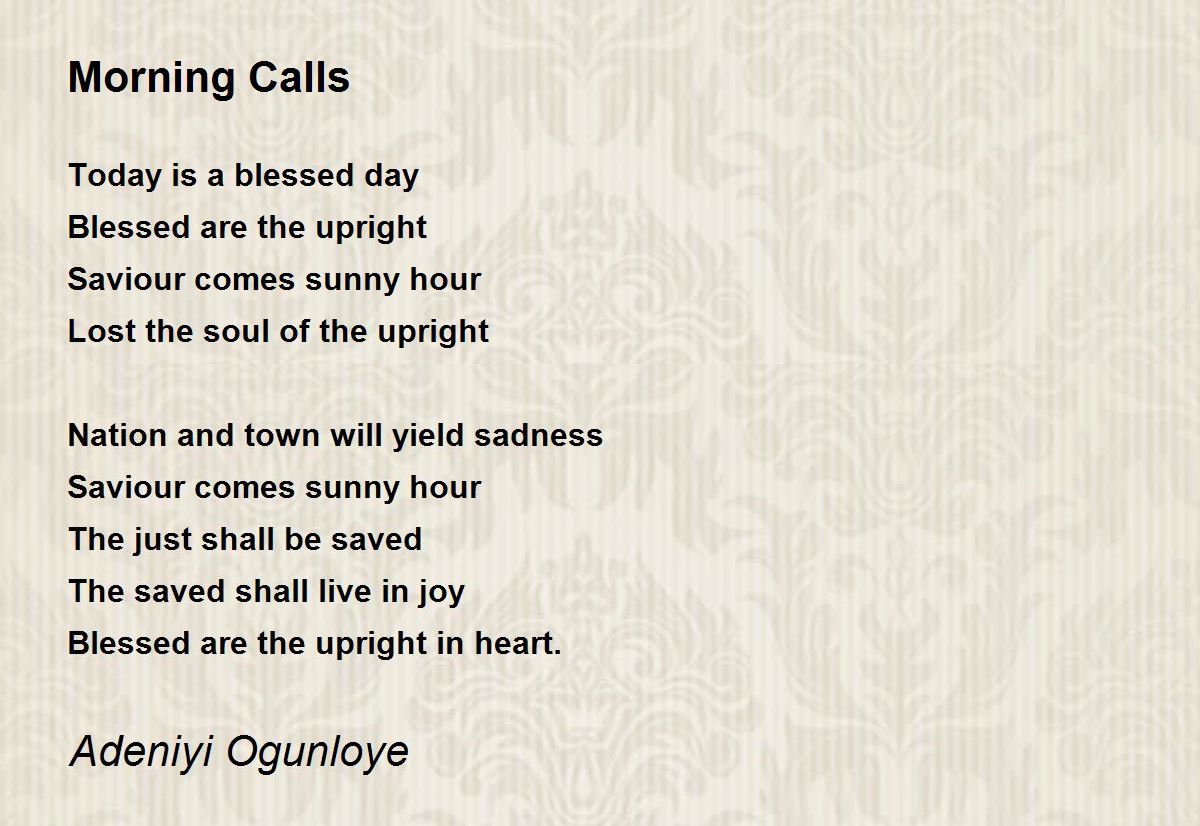 *MORNING CALLS* _by Adeniyi Ogotuntun _ Today is a blessed day Blessed are the upright Saviour comes sunny hour Lost the soul of the upright Nation and town will yield sadness Saviour comes sunny hour The just shall be saved The saved shall live in joy Blessed are the upright in heart. BACKGROUND OF THE POET Adeniyi Ogotuntun's background as a poet Is an inferred from his music, which showcases his spiritual and inspirational themes. Here's a possible background for his poem ¹ ² ³: - *Spiritual Inspiration*: Adeniyi Ogotuntun's work, such as his song 'Olorun Agbaye', suggests a strong spiritual foundation, emphasizing God's mercy and blessings. - *Gospel Music Influence*: His music genre appears to be gospel, which might influence his poetry style, themes, and tone. - *Contemporary Style*: With releases on platforms like SoundCloud and Audiomack, Adeniyi Ogotuntun's work seems to cater to a modern audience, possibly blending traditional and contemporary themes. Some possible biographical details include ²: - *Artistic Expression*: Adeniyi Ogotuntun is actively creating music, with recent releases like 'AKIKITAN' in 2024. - *Online Presence*: He has a presence on music streaming platforms, which might indicate a desire to reach a wider audience. SUMMAY The poem is a spiritual and uplifting piece that explores themes of salvation, moral integrity, hope, and joy. It emphasizes the importance of seeking spiritual redemption and living a virtuous life, promising joy and happiness to those who are saved. LANGUAGE AND STYLES The language is lyrical, simple, and accessible, with a clear and consistent rhythm. The style is characterized by: - *Formal tone*: The poem's language is formal and reverent, reflecting its spiritual themes. - *Repetition*: The repetition of key phrases creates a sense of urgency and emphasis. - *Imagery*: Vivid imagery helps to create powerful visual impressions and convey the poem's themes. - *Symbolism*: The use of symbols adds depth and complexity to the poem's themes. - *Rhythm*: The poem's rhythmic flow enhances its musical quality and makes it more engaging. THEMES His poetry explore themes of hope, redemption, and spiritual growth, as seen in his music. The poem explores several themes, including: - *Spiritual Salvation and Redemption*: The poem emphasizes the importance of seeking spiritual salvation and redemption, highlighting the role of a savior in achieving this goal. - *Moral Integrity*: The poem stresses the importance of being upright and morally sound, suggesting that this integrity is crucial for spiritual growth. - *Hope and Optimism*: The poem conveys a sense of hope and optimism, encouraging the reader to strive for righteousness and trust in a higher power. - *Joy and Happiness*: The poem promises joy and happiness to those who are saved, implying a state of contentment and fulfillment. POETIC DEVICES The poem employs several poetic devices, including: - *Imagery*: The poem uses vivid imagery to describe the blessed day, the savior, and the joy of the saved, creating powerful visual impressions. - *Metaphor*: The comparison of the savior to a sunny hour is a metaphor that emphasizes the importance of spiritual guidance. - *Repetition*: The repetition of 'Savior comes sunny hour' creates a sense of urgency and emphasizes the significance of spiritual salvation. - *Alliteration*: Although not explicitly evident, the poem's rhythmic flow suggests a possible use of alliteration to enhance its musical quality. - *Symbolism*: The savior and the upright may symbolize abstract ideas of redemption and moral integrity, adding depth to the poem's themes. *STRUCTURE OF THE POEM The poem's structure appears to be: - *Short stanzas*: The poem consists of short stanzas or lines, which creates a sense of simplicity and directness. - *Free verse or lyrical*: The poem's structure seems to be more free-flowing or lyrical, with a focus on conveying emotions and ideas rather than following a strict rhyme or meter. MOOD AND TONE The mood of the poem is: - *Uplifting*: The poem's message of hope, salvation, and joy creates an uplifting and positive mood. - *Reflective*: The poem's themes of spiritual redemption and moral integrity encourage the reader to reflect on their own values and beliefs. - *Inspirational*: The poem's promise of joy and happiness to those who are saved inspires the reader to strive for righteousness and spiritual growth. - *Serene*: The poem's formal tone and rhythmic flow contribute to a serene and peaceful mood, fitting from a spiritual theme. TONE The tone of his poetry is reflective, inspirational, and uplifting, given the nature of his music.
