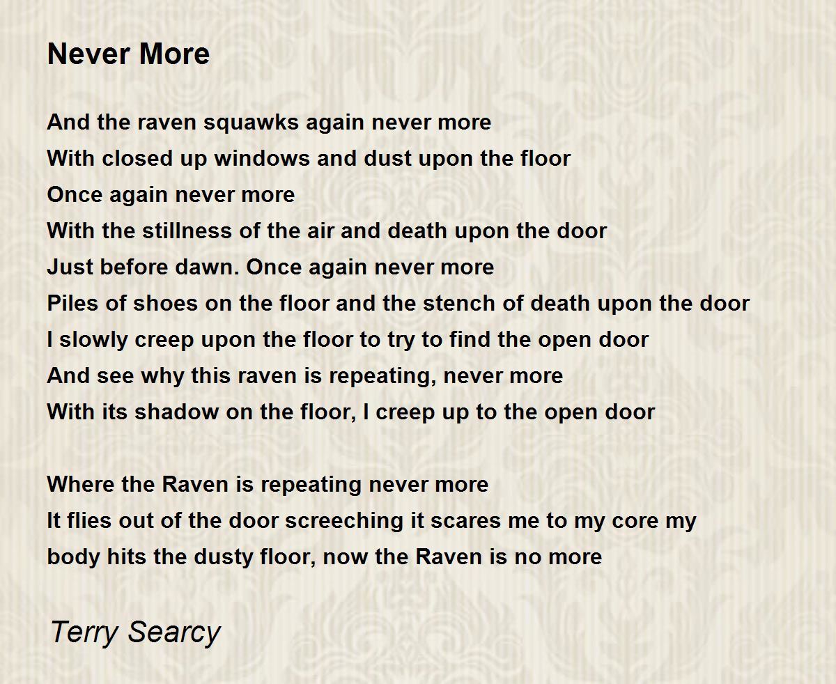 It flies out of the door screeching it scares me to my core my body hits the dusty floor, now the Raven is no more