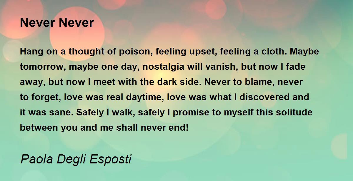 Hang on a thought of poison, feeling upset, feeling a cloth. Maybe tomorrow, maybe one day, nostalgia will vanish, but now I fade away, but now I meet with the dark side. Never to blame, never to forget, love was real daytime, love was what I discovered and it was sane. Safely I walk, safely I promise to myself this solitude between you and me shall never end!