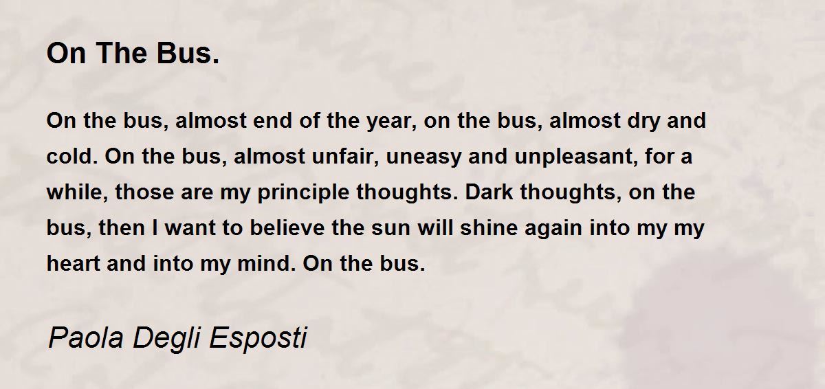 On the bus, almost end of the year, on the bus, almost dry and cold. On the bus, almost unfair, uneasy and unpleasant, for a while, those are my principle thoughts. Dark thoughts, on the bus, then I want to believe the sun will shine again into my my heart and into my mind. On the bus.