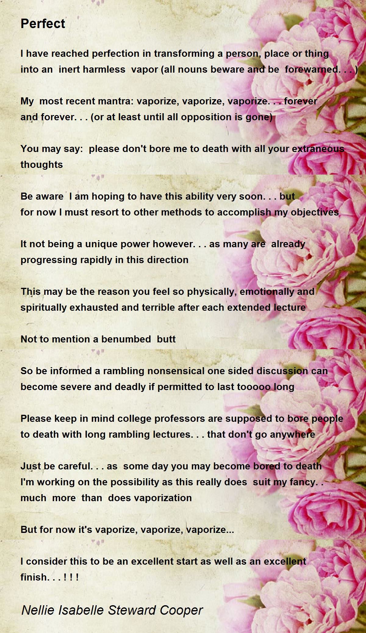 I have reached perfection in transforming a person, place or thing into an inert harmless vapor (all nouns beware and be forewarned...)