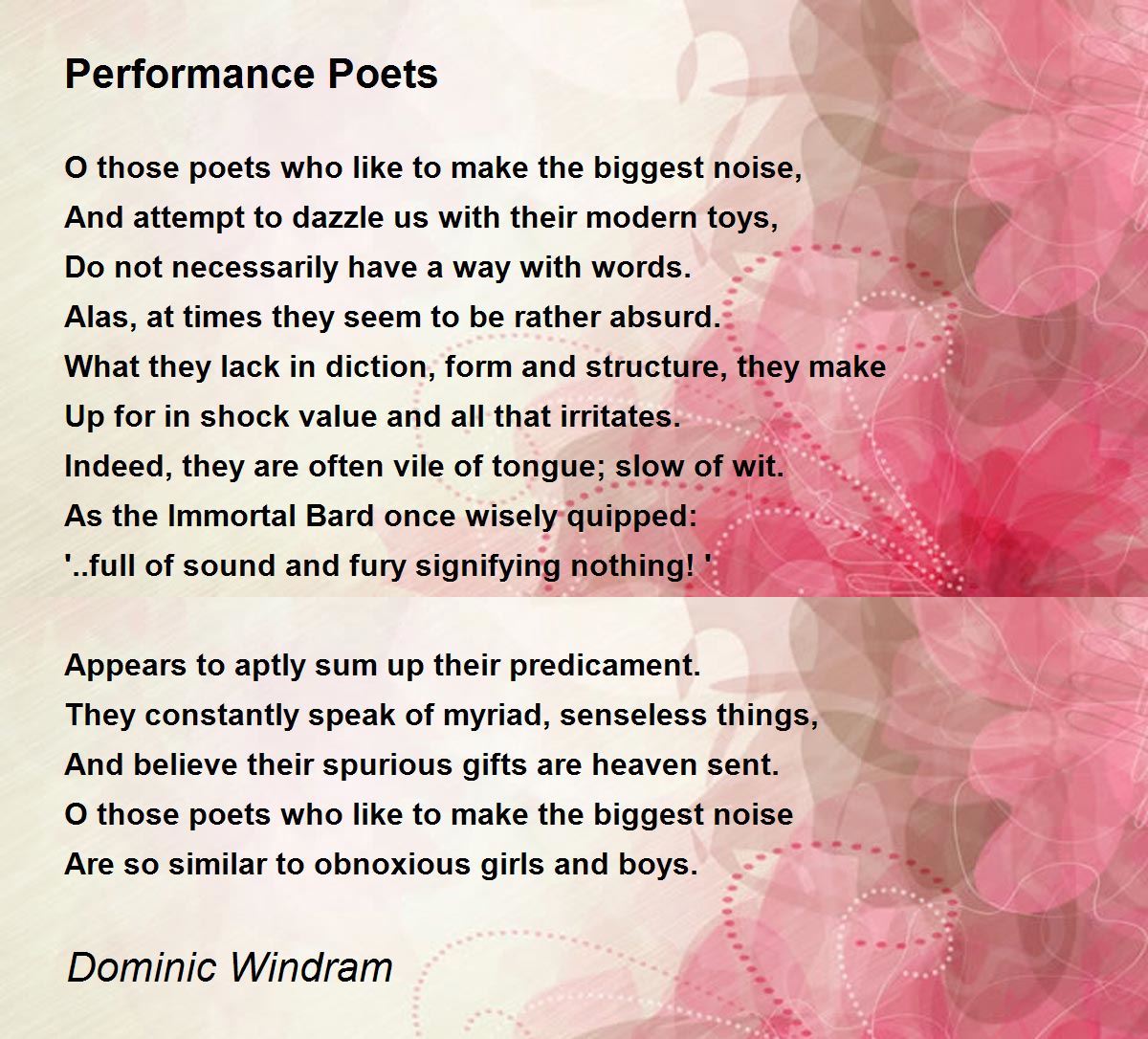 The criticism is well put, Falls upon much noise, No shame, lack of talent and input We see so much as fraud today, Seems that no talent and incompetence, Have a lot of nonsense still to say The best resume' is what the Master said, " Full of sound and fury, signifying, Nothing" Very sadly true, not only for poetry but in many other domains too. Would like to know who the " beautiful " lady is, Flamingo Rose?
