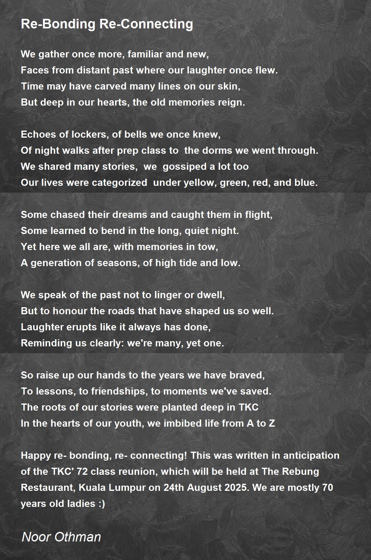 Happy re-bonding, re-connecting! This was written in anticipation of the TKC' 72 class reunion, which will be held at The Rebung Restaurant, Kuala Lumpur on 24th August 2025. We are mostly 70 years old ladies :)