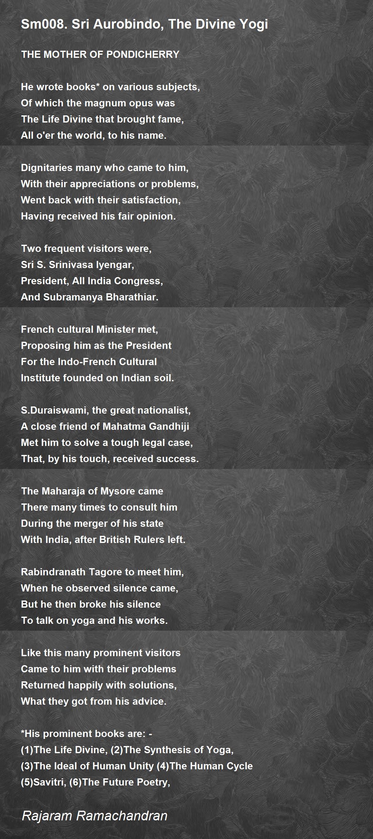 Sri Aurobindo was indeed a great yogi, poet, and philosopher. The number of books and other writings that are credited to him simoly leave us in awe and wonder. Thank you for writing your tribute.